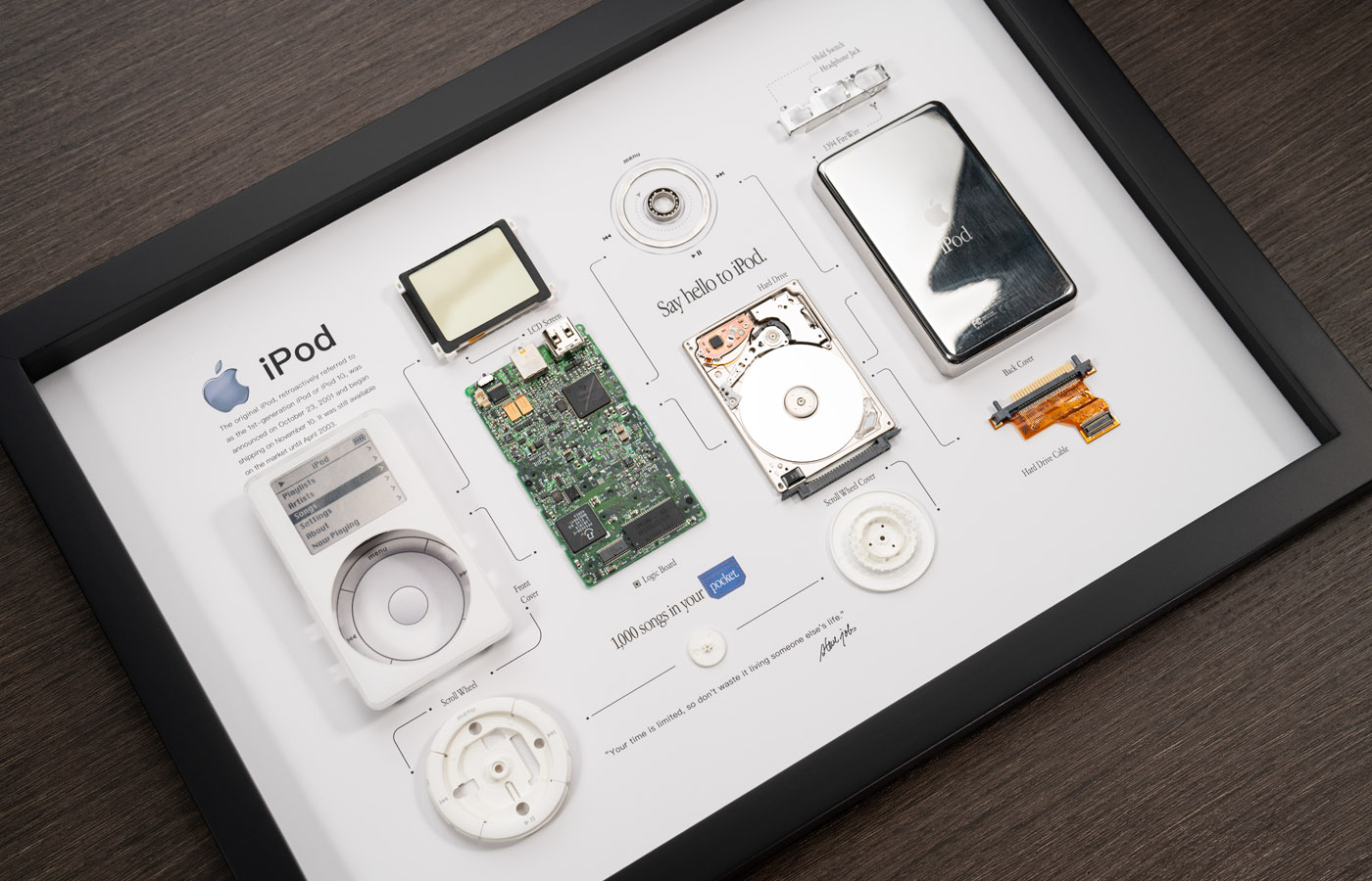On a day last year, Tony Fadell, the creator of the iPod, had his assistant reach out to our studio, expressing his desire for a custom-made iPod 1st Gen frame. We were deeply honored, knowing that our work holds significant meaning and impact. Despite the iPod 1st Gen's iconic status, its rarity and timeless appeal have caused it to disappear from the market. To fulfill Tony's wish, we tirelessly scoured the market until we finally located a device, which we intricately designed and customized to meet his specifications.