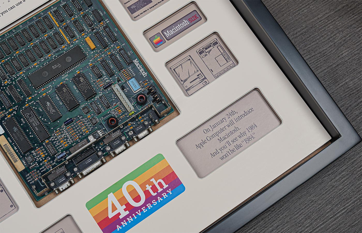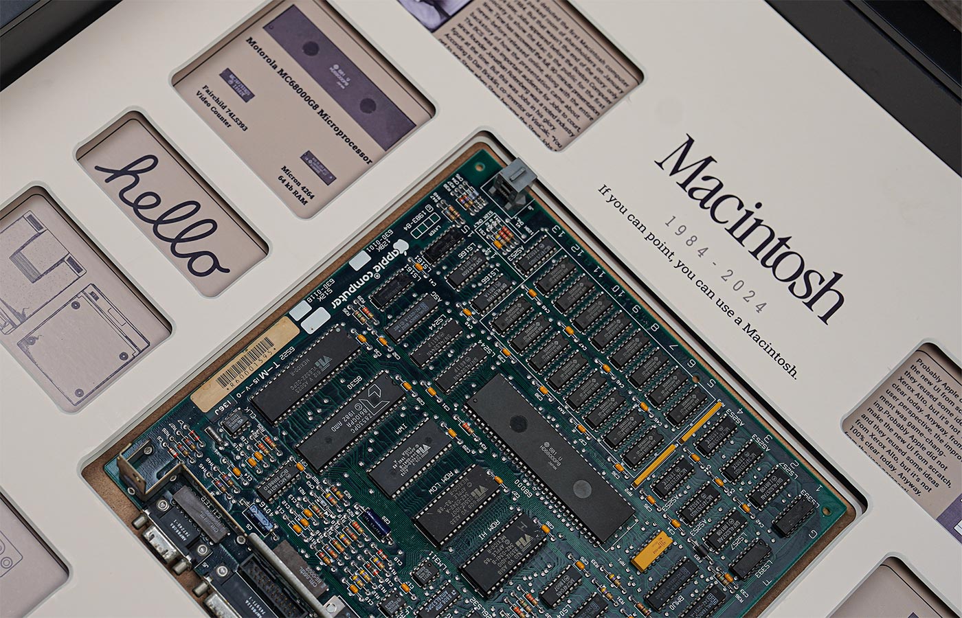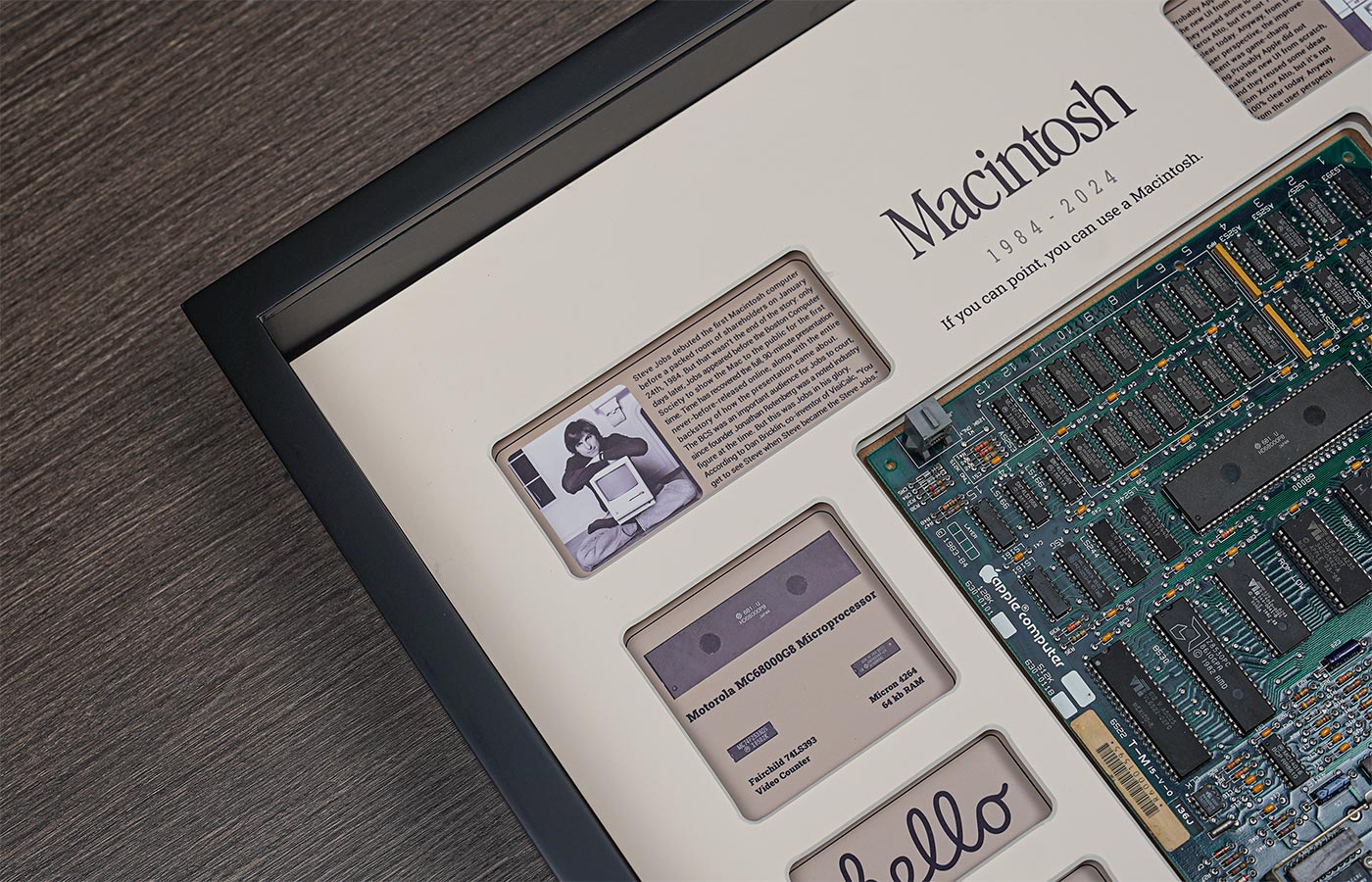 On January 24, 1984, the first "Mac" was released. It is the first successful mass-market all-in-one desktop personal computer with a graphical user interface, built-in screen, and mouse. This year marks the 40th anniversary of the Mac. We've meticulously crafted a unique frame using the Macintosh motherboard. Through this special artwork, we aim to take you on a journey through time, enabling you to relive the classic moments of the Macintosh and feel the excitement and beauty of technological evolution.